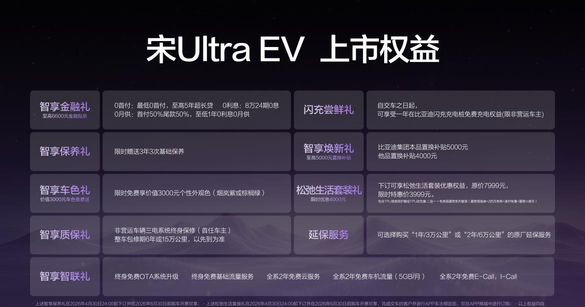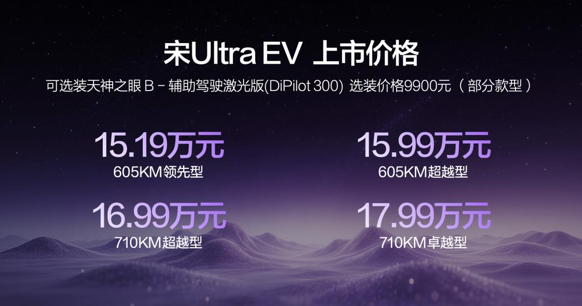 3月26日,比亚迪旗下全新纯电力作——宋Ultra EV细腻登陆市集,共推出605KM跳动型、605KM卓绝型、710KM卓绝型及710KM超卓型四款设立,官方售价区间定为15.19万元至17.99万元。新车全系标配比亚迪第二代刀片电板与闪充手艺,并集成710公里CLTC纯电续航、天使之眼B智能驾驶、云辇-C智能车身甘休、TBC高速爆胎稳行系统等高端设立,以手艺更变重塑B级纯电SUV价值尺度,细腻开启"闪充出行"新篇章。