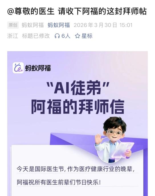 近日,医师和AI之间张开了一场罕见的“拜师传承”。3月30日海外医师节,蚂集结团旗下健康AI蚂蚁阿福发布拜师帖,向宇宙名医拜师学艺,但愿通过名医联结进步AI智能上限,精进医疗健康专科能力。