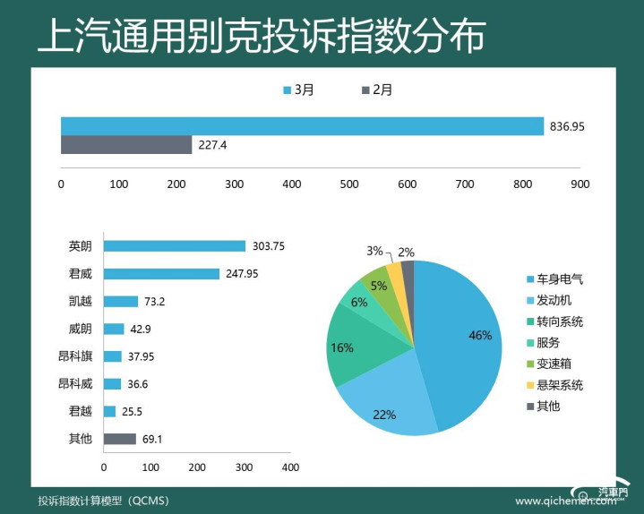 汽车质料投诉点评:俄顷的投诉指数下过期,上汽通用的投诉指数再次大幅攀升。3月份,上汽通用别克的投诉指数达到了836.95,排在了投诉榜的第三位。而从投诉反馈来看,样貌台开裂、高位刹车灯开裂、转向卡滞异响仍然是主要槽点。