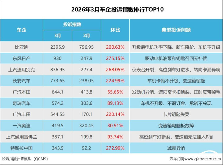4月1日,汽车门网发布了2026年3月的汽车投诉指数。2月份投诉指数大幅下过期,3月份全体投诉指数在此显然回升。3月份,汽车门网的全体投诉指数达到了15146.9,环比2月份飙升了一倍。一方面,3月份回到了往日的职责和生计中。另一方面,多家车企际遇围聚投诉进一步推高了投诉指数。 3月份企业投诉指数TOP10上榜车企投诉指数环比均大幅增长。部分车企的投诉指数环比飞腾了两倍以上。其中,比亚迪、东风日产、广汽丰田、特斯拉中国王人出现了新的围聚投诉。 以下是2026年3月车企投诉指数的具体分析: 第别...