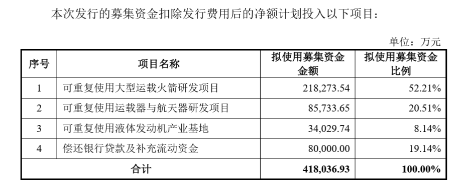 据招股书,这次召募资金将用于可不异使用大型输送火箭研发情势、可不异使用输送器与航天器研发情势、可不异使用液体发动机产业基地以及偿还银行贷款及补充流动资金。