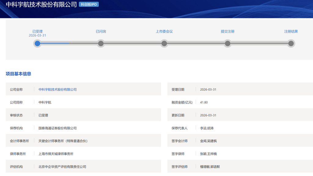 3月31日,据上交所官网显现,中科宇航本事股份有限公司(以下简称“中科宇航”)科创板IPO获受理,保荐机构为国泰海通,本次IPO拟募资41.8亿元。
