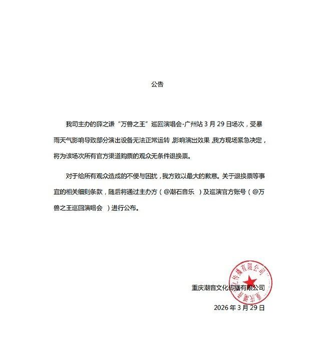 #头条创作检修营# 【薛之谦广州演唱会内场天塌了】薛之谦广州演唱会遇极点暴雨导致舞台竖立瘫痪,他现场晓示全额退票,并报销外地不雅众机票旅店,将突发危急回荡为包袱担当的行业标杆事件。 3月29日,薛之谦万兽之王巡演广州站遇到强对流天气,暴雨陪伴冰雹和雷暴大风,导致河汉体育中心内场严重积水,不雅众描摹为水患现场,部分区域致使需延时开场避雨。 上演开动后,暴雨激发灯光系统、表层屏幕、荧光棒等中枢竖立大面积故障,舞台机械停摆,现场后果远低于预期。 薛之谦在上演半途发现竖立损坏进度远超导演组此前见告的部...