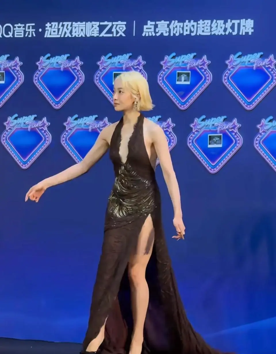 更绝的是她的造型。 一头漂白的金色短发,配上一条深咖色、开叉开到大腿根、照旧真空上阵的挂脖战胜。 这造型一出来,热搜平直爆了。 但你要认为这只是博眼球,那就错了。 全球盘考的焦点是:这种健康、有劲量、充满掌控感的性感,多久没在红毯上见过了?